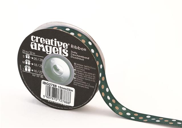 Saténová stuha, 15 mm x 22 m, tmavolzelená, bodkovaná
