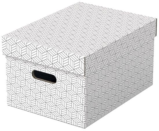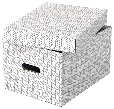 Súprava troch stredných lepenkových úložných boxov s moderným a štýlovým geometrickým dizajnom.