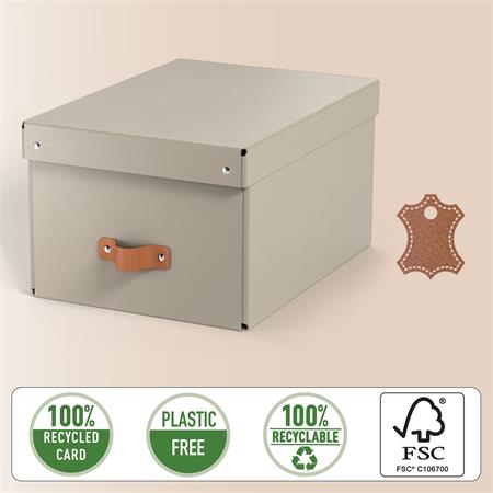 Súprava dvoch stredne veľkých úložných boxov s vekom vyrobených zo 100% recyklovanej lepenky s certifikátom FSC v modernom a čistom dizajne, ktorý doplní vašu domácnosť aj kanceláriu.
