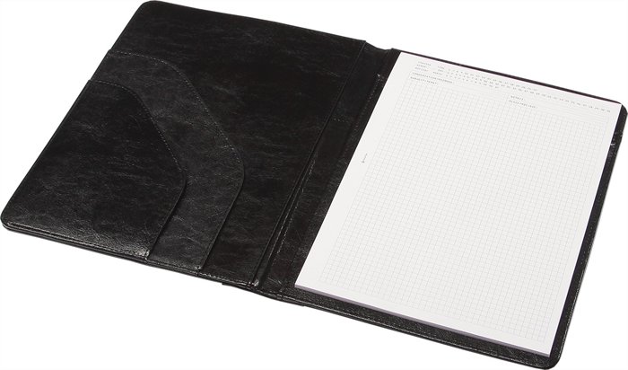 na ľavej strane 2 vrecká, na pravej strane vyberateľný štvorčekový poznámkový blok