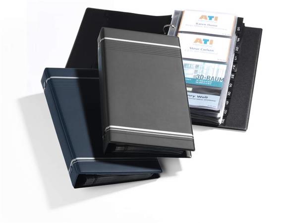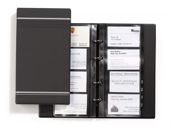 Vizitkár s krúžkovou väzbou, matným povrchom a striebornými ozdobnými pruhmi.