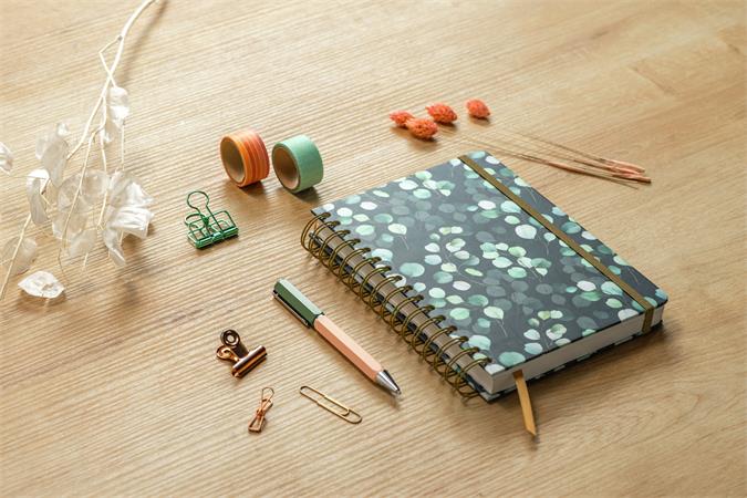 Špirálový zošit s tvrdou obálkou, s motívom  eukaliptu -matný motív - zelená špirálová väzba  -mikroperforované listy -240 bodkovaných strán -120 g biely papier -vrecko na zadnej stane obalu -70% používaného materiálu s certifikátom FSC -vegánsky produkt