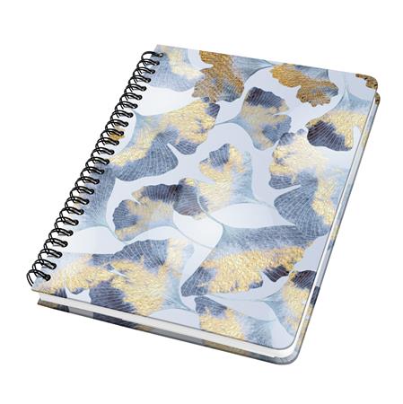 Špirálový zošit s tvrdou obálkou, s motívom Ginko -matný motív -čierna špirálová väzba -mikroperforované listy -120 bodkovaných strán -100 g biely papier -vrecko na zadnej stane obalu -FSC certifikát -vegánsky produkt
