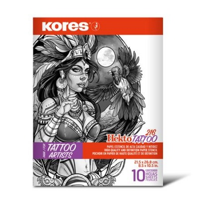 Hectografický papier KORES na prenášanie motívu je obľúbenou voľbou u množstva tatérov. Odporúča sa najmä na ručné prekresľovanie, ale pri správnom nastavení tlačiarne ho je možné použiť aj ako termopapier. Papier KORES sa vyrába v rozmere 21,5 x 36,8 cm v balení 100ks. Každý hárok má 3 vrstvy pričom horná vrstva má vopred predtlačené pravítko pre jednoduchšie navrhnutie motívu.