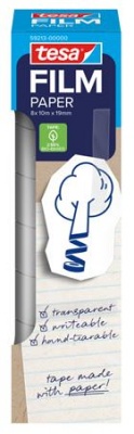 Priehľadná lepiaca páska tesafilm®  s papierovým nosičom je mimoriadne všestranná a nemala by chýbať v žiadnej domácnosti, kancelárii ani škole.  Dá sa popisovať a na svetlých povrchoch, ako je papier, je takmer neviditeľná.