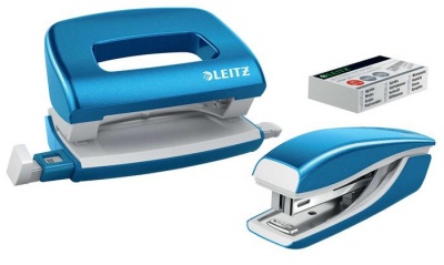 Zošívačka a dierovačka, set, 10 listov, kovový, LEITZ "Wow Mini", modrá