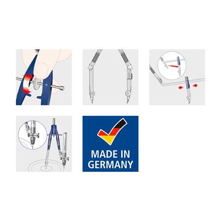 -presný kružidlo so stredovým kotúčom--mechanizmus na rýchle nastavenie-vymeniteľná ihla a hrot-kĺbový hrot a ihla-ostrý hrot-maximálny priemer kruhu: 260 mm-maximálne rozopnutie: 395 mm-dĺžka: 156 mm-príslušenstvo: noha pripojiteľná ku kružidlu, predlžovacia tyč, univerzálny adaptér, náhradný hrot kružidla