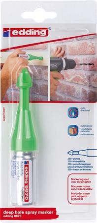 Tekutý kriedový sprej s patentovaným pumpovým mechanizmom pre nepermanentné značenie na ťažko dostupných miestach, takmer na všetky materiály. - jedinečne tvarovaná tryska umožňuje značenie otvorov s hĺbkou 50 mm a priemerom 3-13 mm - možno ju použiť z akéhokoľvek uhla a výšky, dokonca aj nad hlavou - nepermanentnú tekutú kriedu možno ľahko zotrieť z nesavých povrchov pre rýchle opravy - farba: neónovo zelená