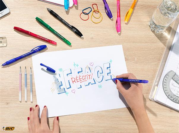 písaný text zmizne v dôsledku prešúchania gumou na konci vrchnáka (dá sa neobmedzene veľa krát prepisovať a znova mazať)