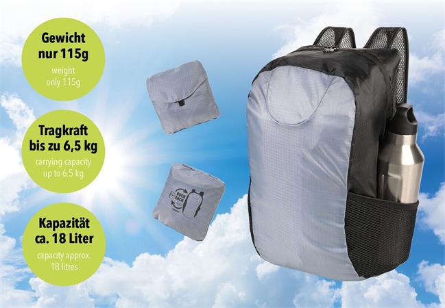 Či už pri plánovanom alebo spontánnom nákupe, tento skladací batoh je skvelou voľbou vďaka svojej úspornosti. -hmotnosť: iba 115 g -veľký hlavný priečinok na zips -vnútorné vrecko so suchým zipsom -2 bočné vrecká na fľašu a dáždnik -nastaviteľné ramenné popruhy -objem: približne 18 litrov -nosnosť: približne 6,5 kg -materiál: 100 % polyester -priestorovo úsporný dizajn