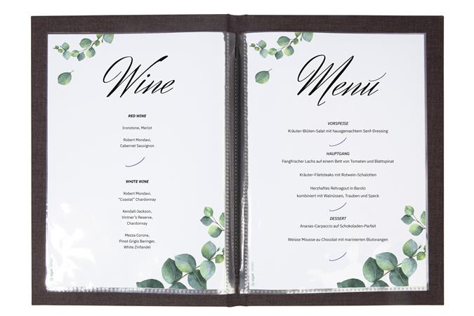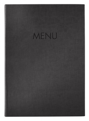 Kvalitný obal na jedálny lístok, ktorý nikdy nevyjde z módy. -formát A4 -rozmery: 210 x 297 mm -medzinárodný nápis na obálke: „Menu“ -dokumenty sa dajú ľahko vkladať a vymieňať -viazanie pomocou gumičky -ľahko sa čistí -odolný PU materiál -materiál odolný voči oderu a poškriabaniu -obsahuje 2 priehľadné puzdrá – na 8 strán (ďalšie náhradné puzdrá dostupné pod číslom produktu SISM180)