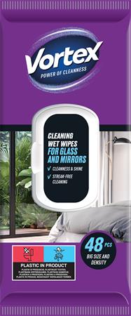 Vlhčené utierky, na sklenené a zrkadlové povrchy, s uzatvárateľným viečkom, 48 ks, VORTEX