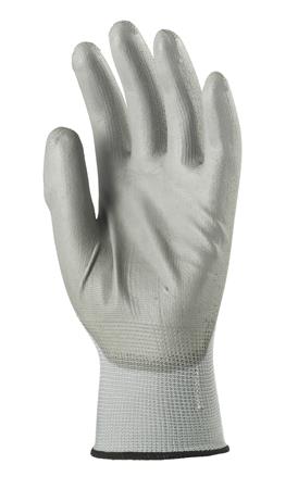pletené, pružné, odolné proti roztrhnutiu, 100% polyamidové vlákna, na dlani namočené do polyuretánu, antistatické, gumené manžety, s vetraním, farba: sivá