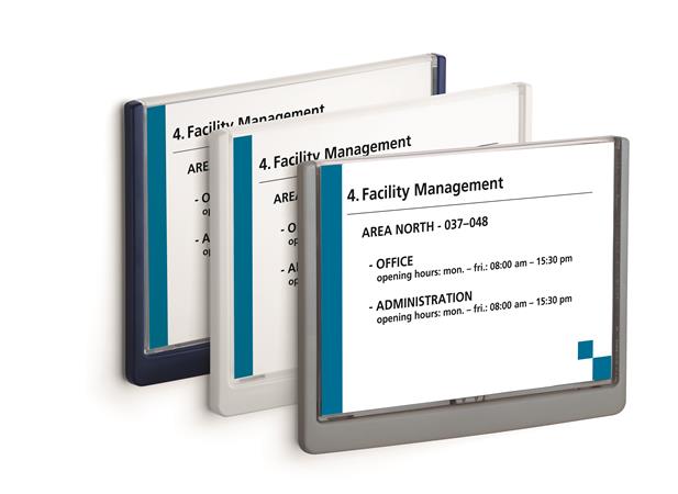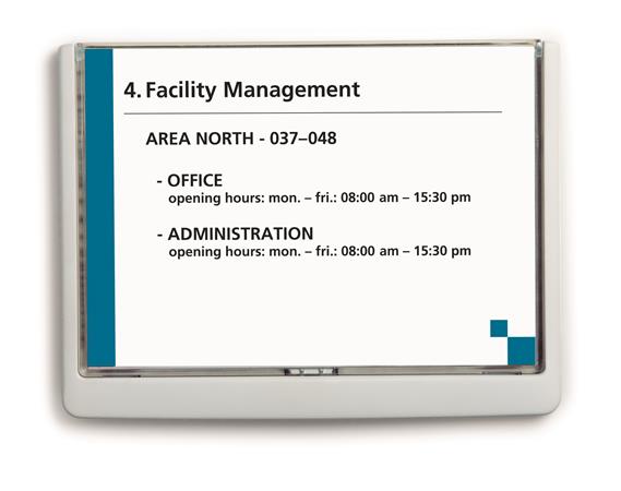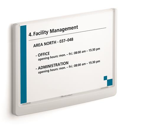 Inovatívna informačná tabuľa s atraktívnymi zaoblenými hranami. Spája v sebe moderný dizajn a funkčnosť. - oblasť použitia: vo vzdelávacích centrách, nemocniciach, stravovaní atď. - vložky sa dajú jednoducho vymeniť - upevnenie: skrutka - materiál: plast - orientácia: na výšku - formát: A5 - vonkajšie rozmery: 233 x 177 mm (š x v) - rozmery štítku: 210 x 148,5 mm (š x v) - spolu s montážnou sadou, vŕtacou šablónou a návodom - vložky na tlač sú k dispozícii samostatne