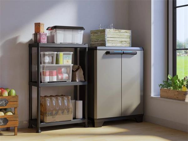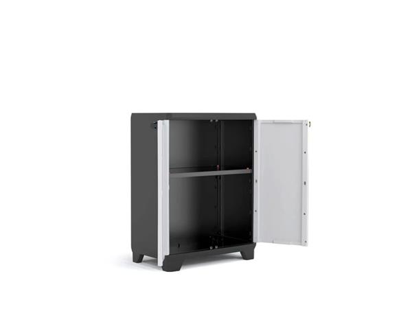 Odolná plastová  skriňa vhodná do garáže, na chatu, na terasu alebo do pivnince. - jednoduchá montáž a údržba - dvere uzamykateľné visiacim zámkom (nie je súčasťou balenia) - 1 nastaviteľná polica s nosnosťou 15 kg - nastaviteľné nôžky - s certifikátom TUV GS -rozmery skrine: 68x39x90 cm (šírka x hĺbka x výška) - rozmery políc: 63x33 cm - celková hmotnosť: 7,5 kg