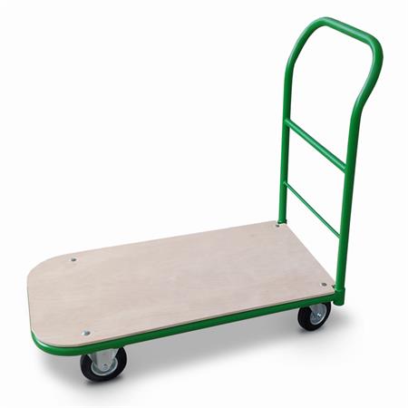 stabilná, zváraná oceľ, úložná plocha z 12 mm hrubej masívnej drevotriesky (buk), rozmery plochy: 850 x 550 mm, nosnosť: 200 kg, výška prepravného vozíka s rúčkou: 910 mm, priemer koliesok: 125 mm