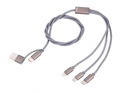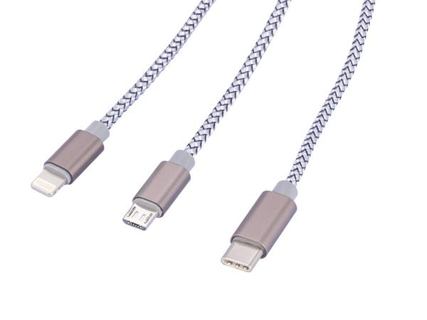 Praktický spoločník na každý deň, ktorý je vhodný aj ako darček! -už žiadne zamotané káble - môžete nabíjať až 3 zariadenia súčasne! - textilom potiahnutý kábel - dĺžka 1 meter - napájanie: 5V/2,5 A - vhodné pre rýchle nabíjanie - pripojenie kdekoľvek - výstupy: USB C, USB-B, micro-USB, Lightning