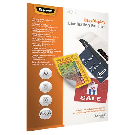 Laminovacia fólia za tepla, 80 mikr., A3, lesklá, samolepiaca, 25 ks, FELLOWES "Admire Easy Display"